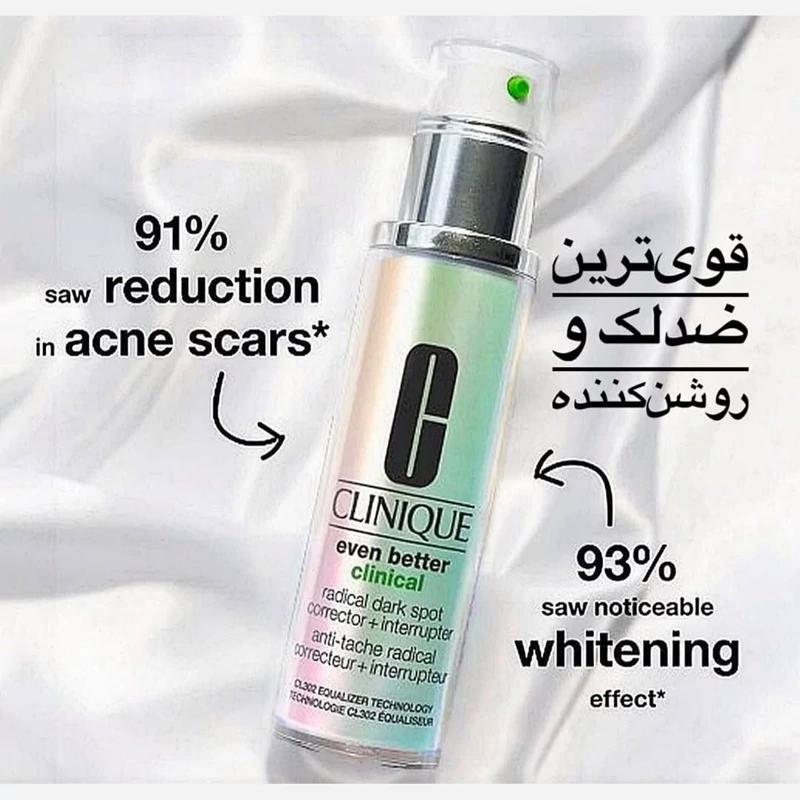 پوست شما سزاوار درخشندگی و یکنواختی است! سرم ضد لک کلینیک با فرمولاسیون پیشرفته و تکنولوژی Radical Dark Spot Corrector طراحی شده تا لکههای تیره، جای جوش و تیرگیهای ناشی از افزایش سن را کاهش دهد و رنگ پوست شما را روشن و یکنواخت کند.